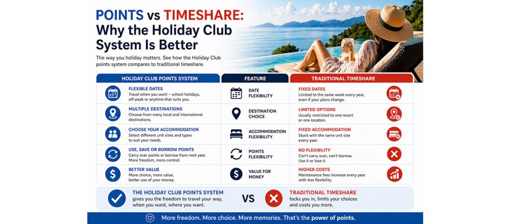 Traditional timeshare locks you into: One resort One week Every year The Holiday Club removes that completely. With points, you get: Flexibility Choose: Where you go When you go How long you stay Variety 130+ local resorts 3200+ international resorts Control Use points now Save them Borrow from future Bottom line: Points turn holidays into […]